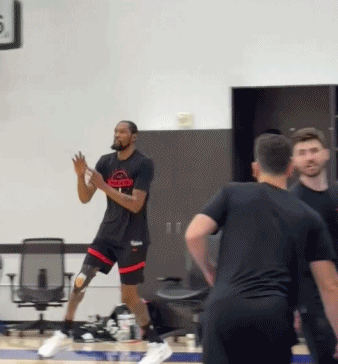 这位明星前锋因上周四训练中遭遇右膝挫伤,缺席了周日的季后赛首战,火箭也输掉了这场揭幕战。在媒体开放的小段训练时间里,这位37岁球星的状态看上去基本恢复如常:他完成跳投、折返跑动、变向移动,动作没有非常明显受限,全程面带笑容。唯一明显的差别就在他的右膝:杜兰特的膝盖缠着运动胶带固定的防护绷带。