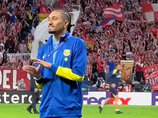 比赛结束后,拉菲尼亚走向看台向巴萨球迷致意。当他遭到附近一群马竞球迷的嘲讽和嘘声时,这位巴西前锋做出了一个带有深意微笑的手势。